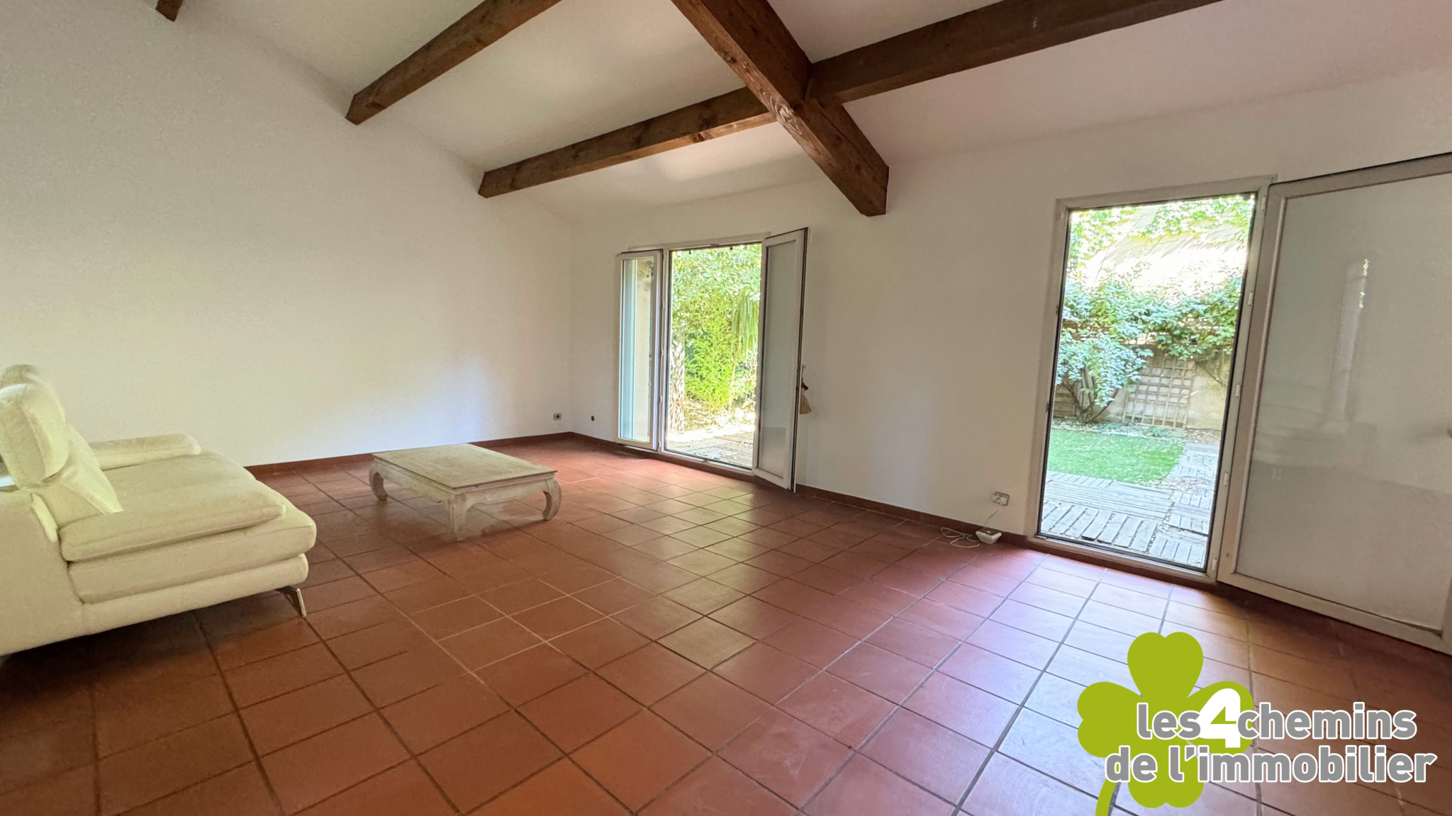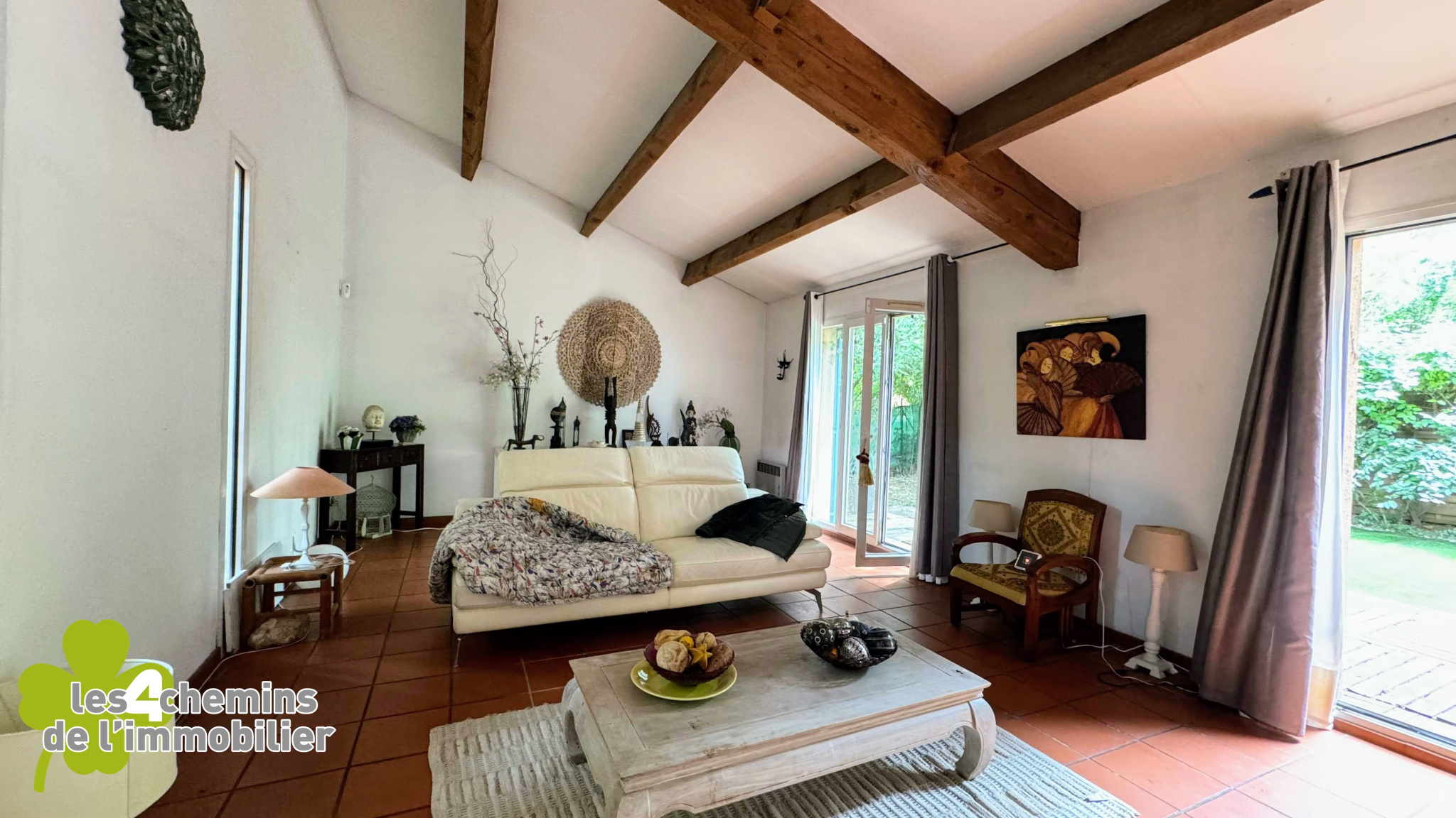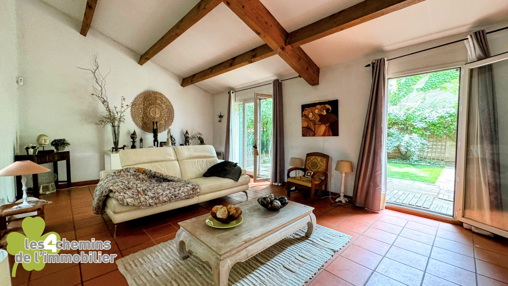 Un salon élégant donnant sur un agréable jardin intime, parfait pour se détendre à l'ombre durant l'été