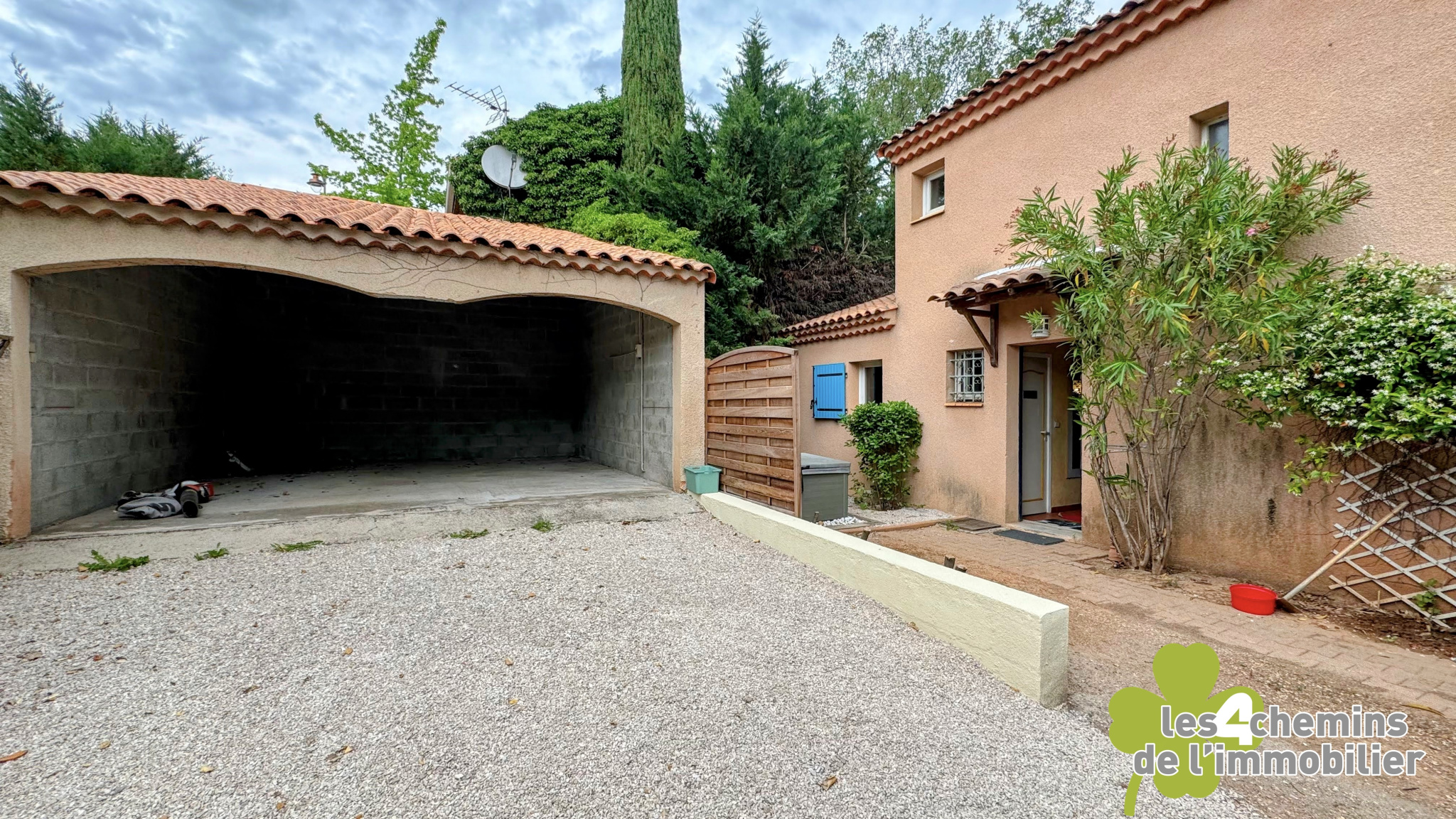 Une cours gravillonnée à l'entrée et un garage ouvert, avec possibilité de le fermer pour accueillir deux voitures