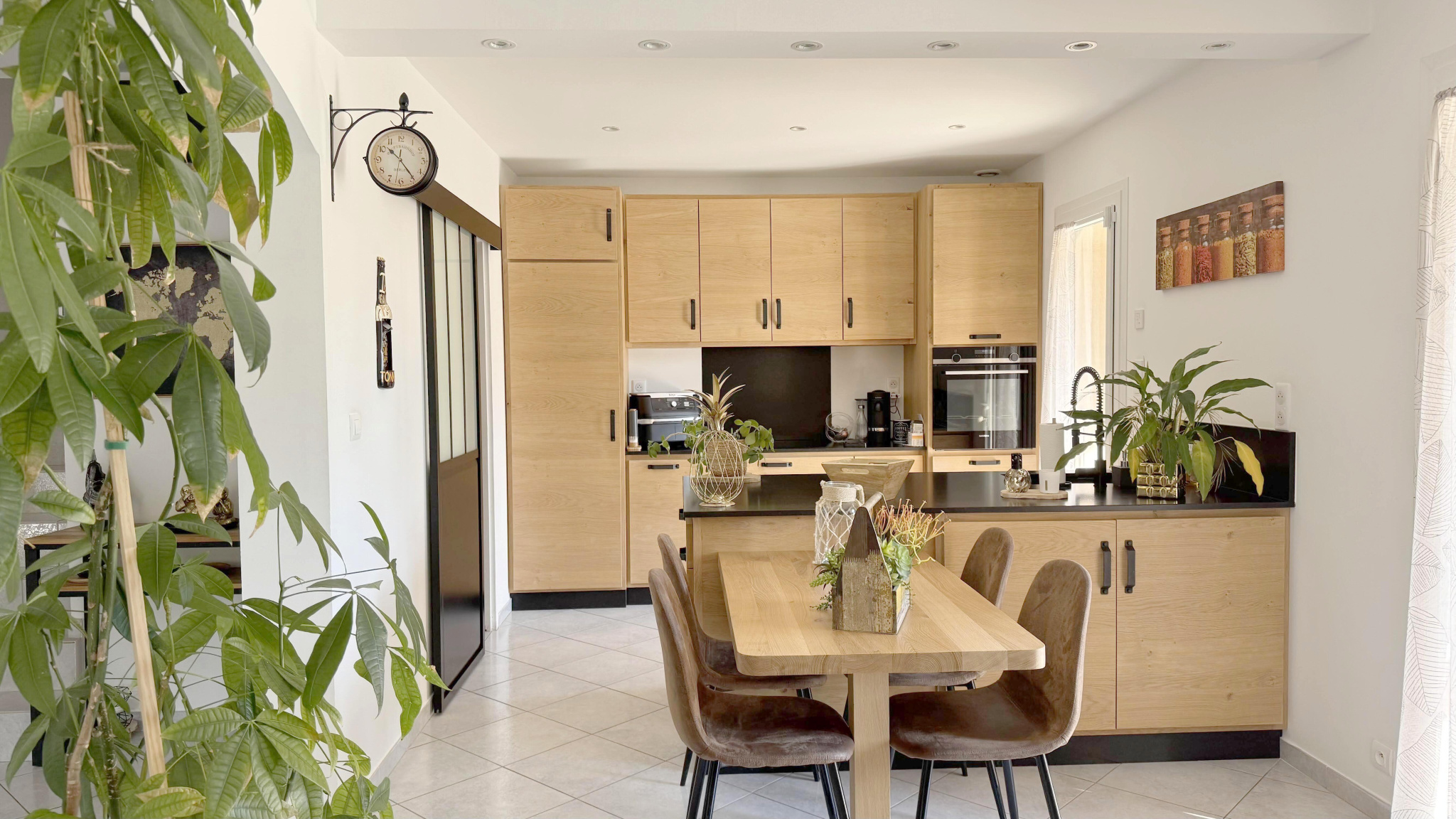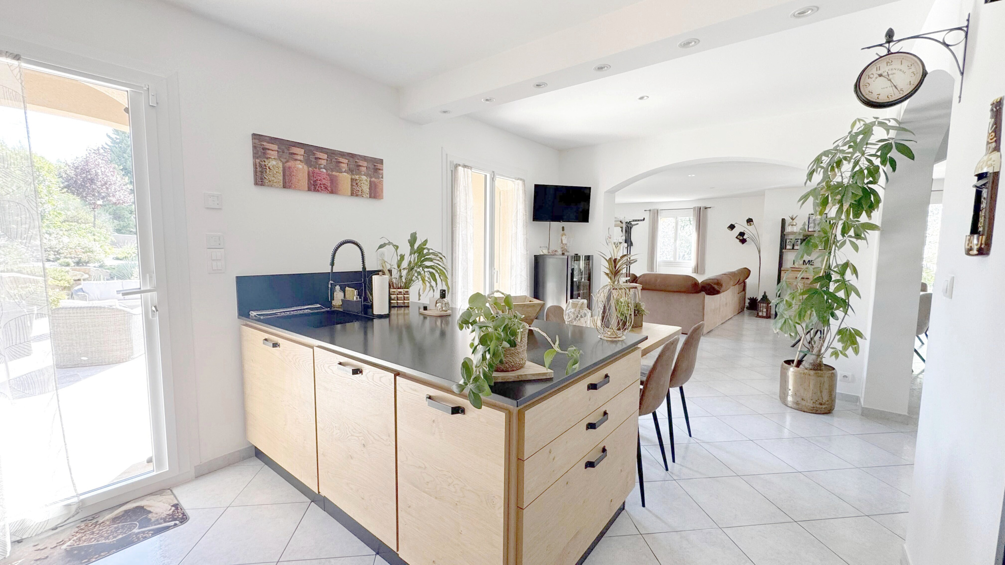 Un vaste séjour avec cuisine ouverte baigné de lumière,