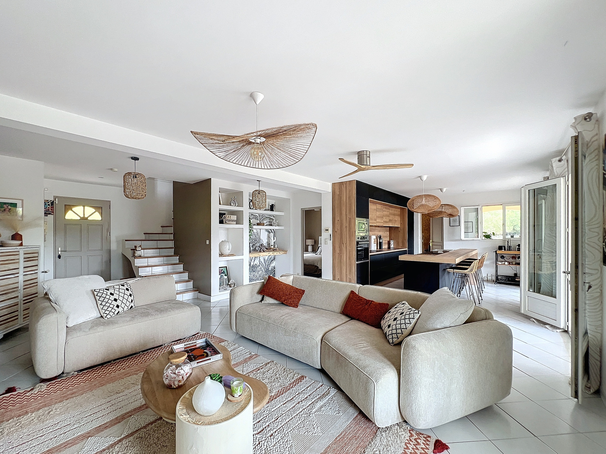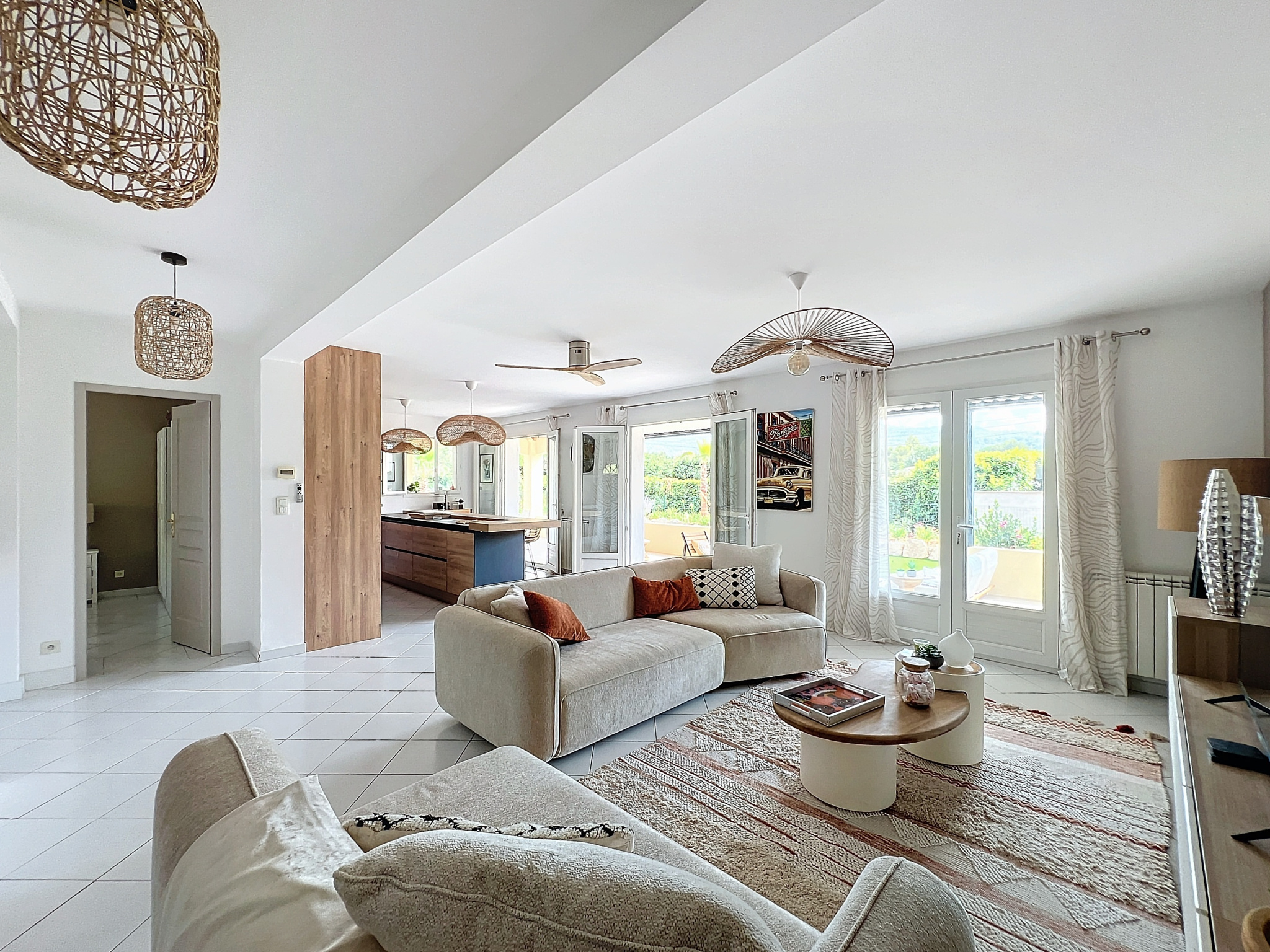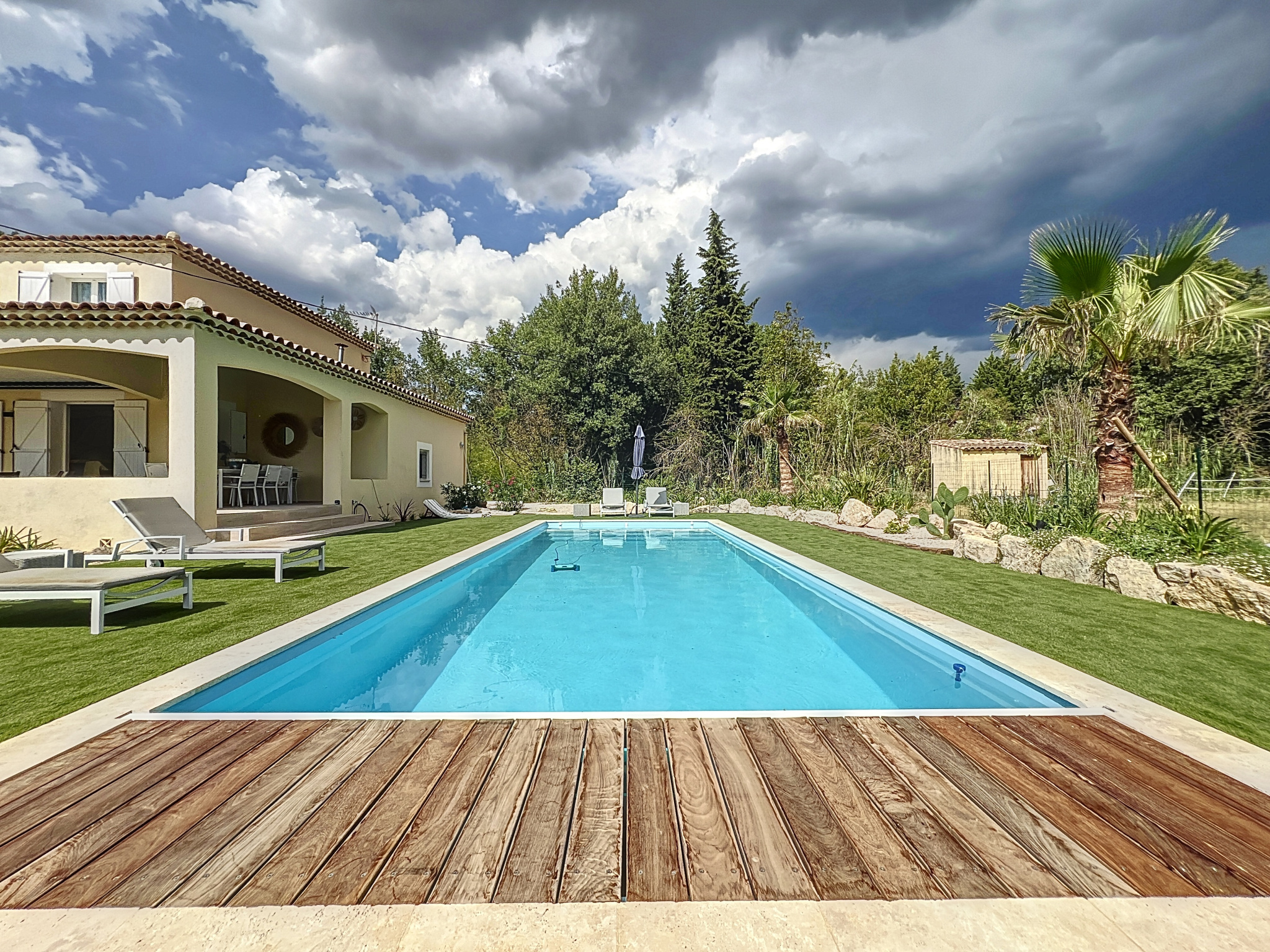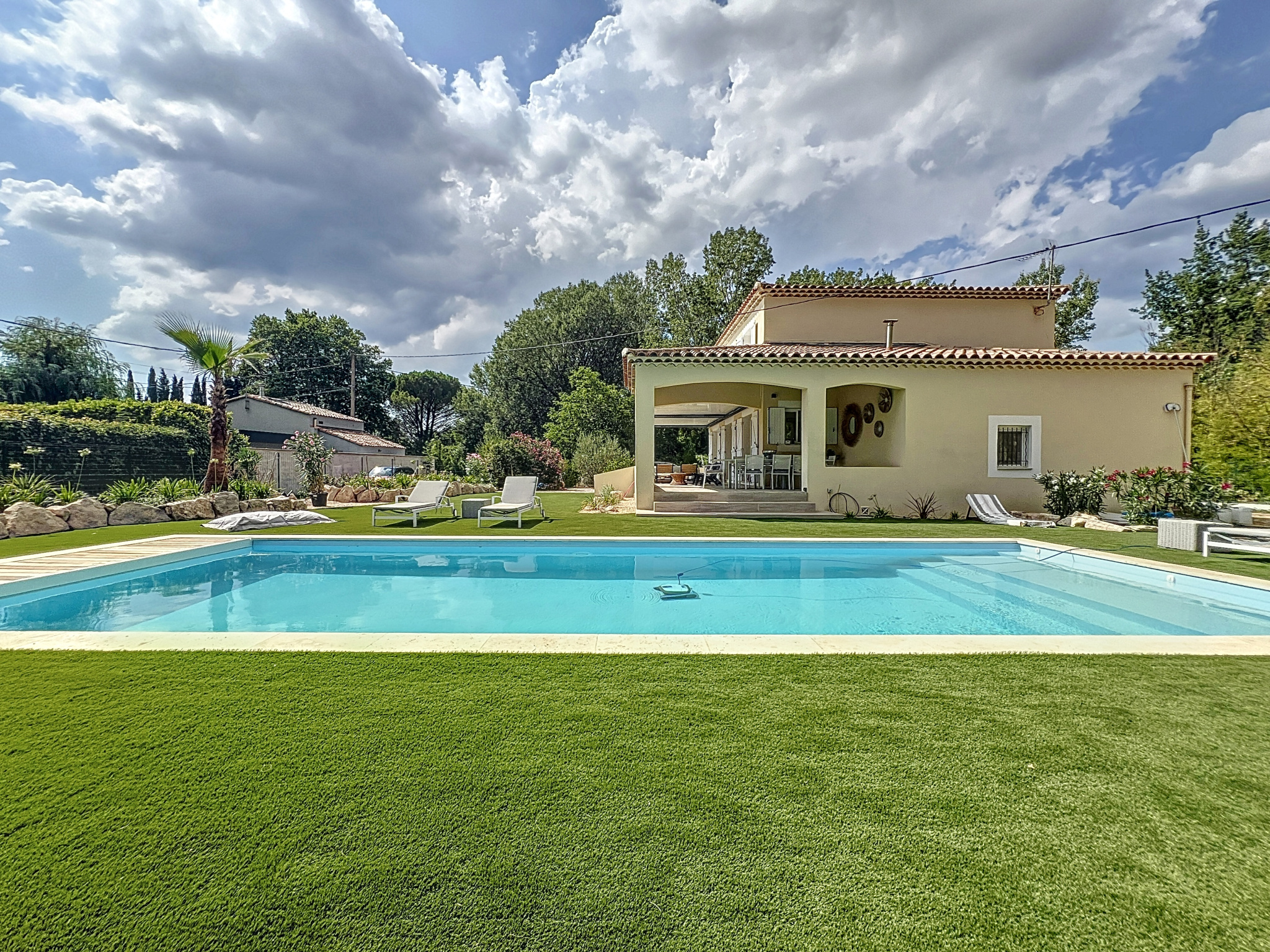 Au calme en fond d'impasse, votre agence Les 4 Chemins de l'immobilier vous présente cette magnifique villa provençale de 140m2 aux très belles prestations. Elle se compose au rez-de-chaussée d'une entrée avec wc, d'un espace séjour / cuisine spacieux et très lumineux de plus de 45m2, et d'une première suite parentale avec salle de bains. A l'étage, vous trouverez une salle de bains, un wc et trois chambres dont une autre grande suite parentale avec salle d'eau et dressing. L'extérieur saura vous séduire par son jardin entièrement paysagé, sa piscine toute neuve, son terrain de pétanque et cette terrasse de plus de 60m2 couverte par une pergola bioclimatique de dernière génération, vous permettant de profiter de ce bel endroit par tous les temps. Construite en 2002, cette villa sur son terrain d'environ 1200m2 vient d'être totalement modernisée à l'intérieur comme à l'extérieur, vous n'avez qu'à poser vos valises ! Prix de vente 690 000EUR frais d'agence inclus honoraires à la charge du vendeur. DPE D ( coûts estimé annuel entre 1990e et 2760e). Mandat délégué par une agence membre de L amepi. A visiter sans tarder! Pour tous renseignements 06 15 59 15 10 Céline Issoire Agent Commercial RSAC 844497578 Tribunal de Commerce Aix en Provence
