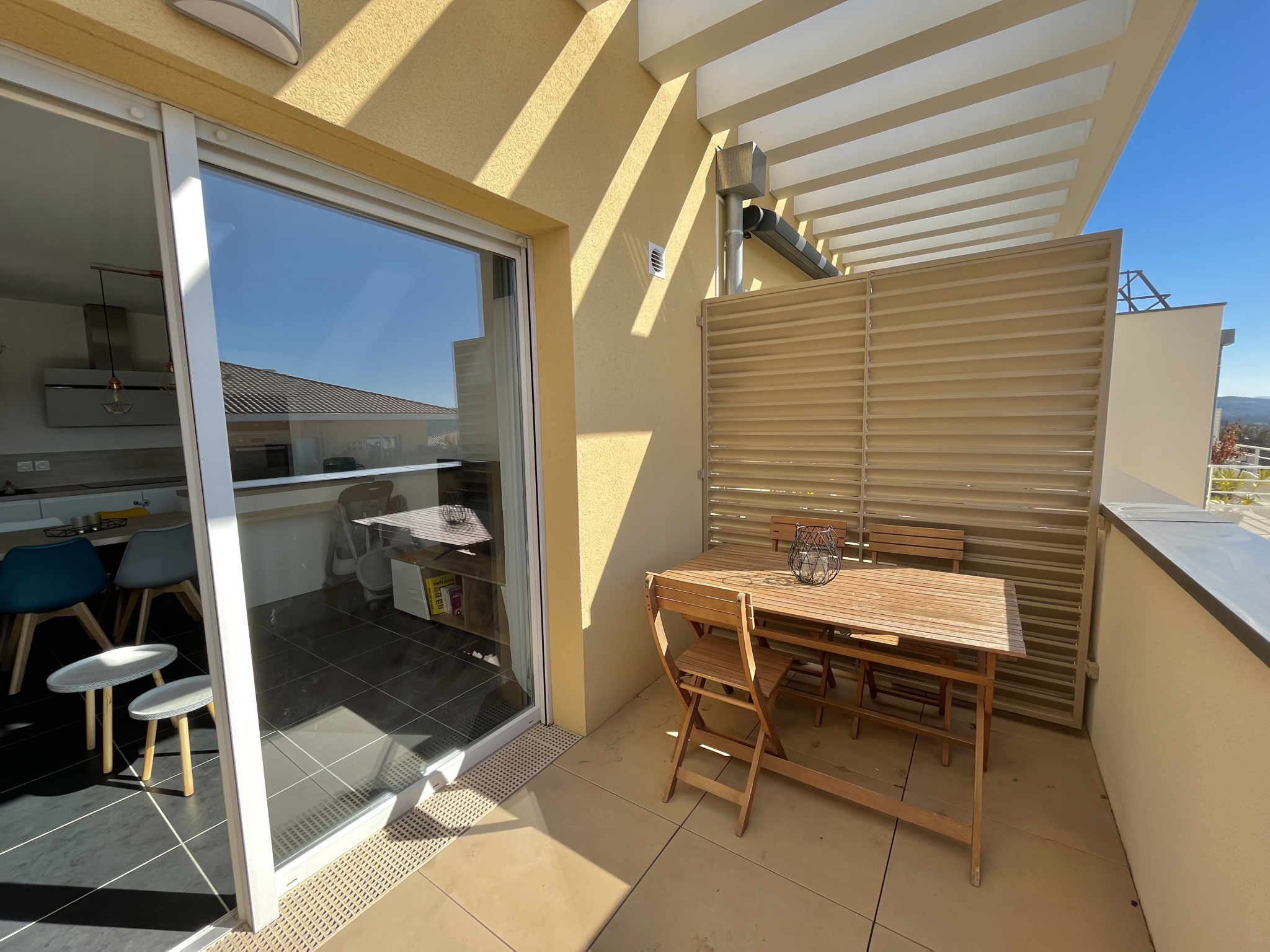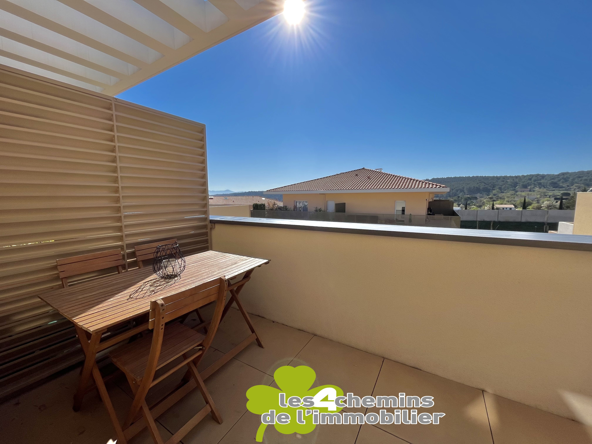 A VENDRE à moins de 15min d'Aix en Provence ( Meyreuil) l'agence Les 4 Chemins de l'Immobilier vous propose en exclusivité cet appartement COUP DE COEUR! dans une résidence neuve et sécurisée, au 2e et dernier étage composé de 3 pièces d'environ 59 m2 habitables comprenant une entrée avec placard, une belle pièce de vie avec une cuisine équipée donnant sur une terrasse avec une vue dégagée. Vous trouverez également 2 chambres avec placards aménagés, une salle de bains et toilette séparé. Climatisation réversible, chauffe- eau thermodynamique, logement connecté par box domotique . 1 placesde parkings en sous sol ( possibilité d'une deuxième ) . Bien en copropriété composée de 62 lots pas de procédure en cours. Charges annuels : 1080EUR A visiter rapidement! DPE A = 32kWh/m2_an emission de gaz à effet de serre A = 1 kgCO2/m2.an ancienne version date le 29/09/2020 Pour tous renseignements Patricia ROGNIN EI 06 38 91 17 51 ;