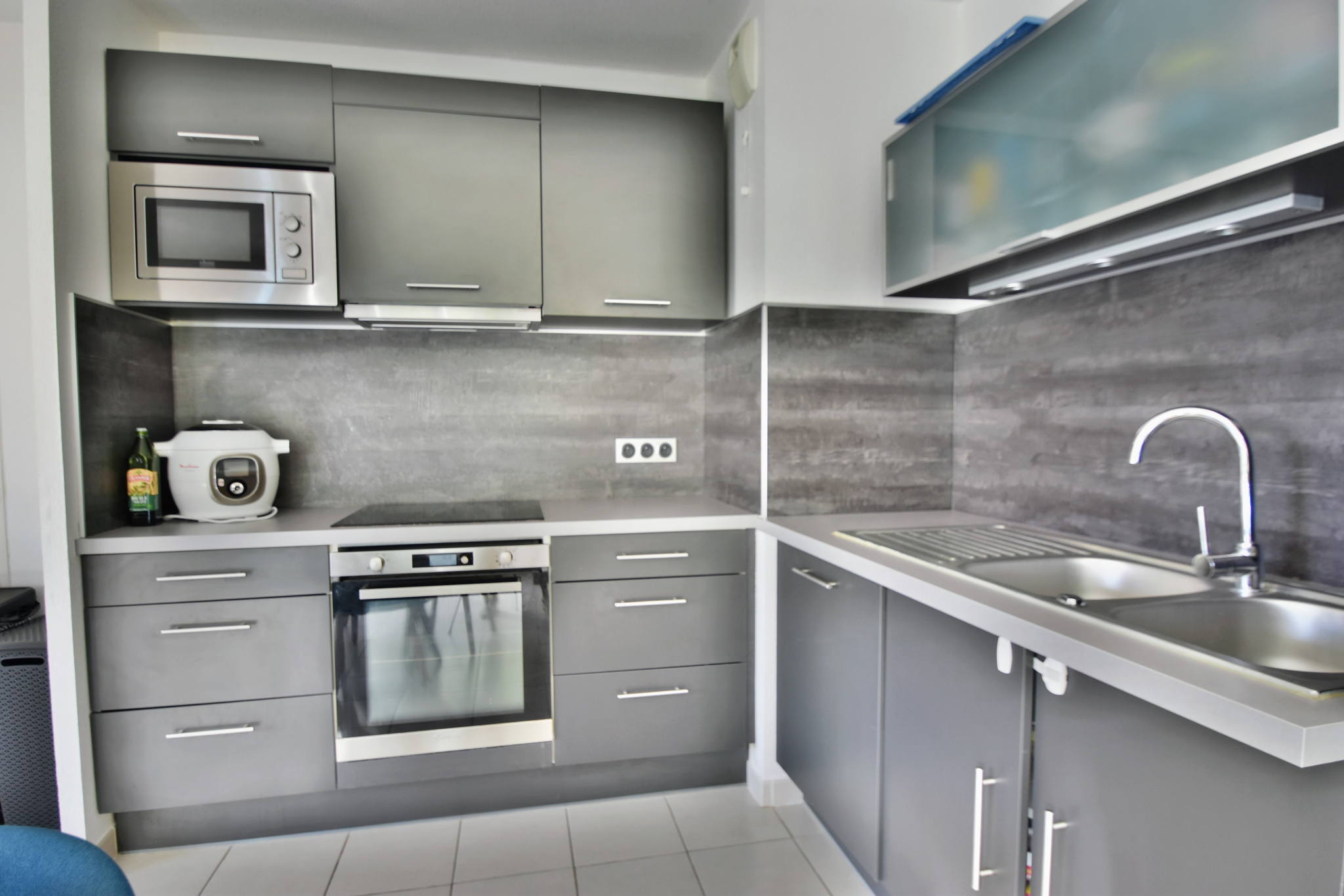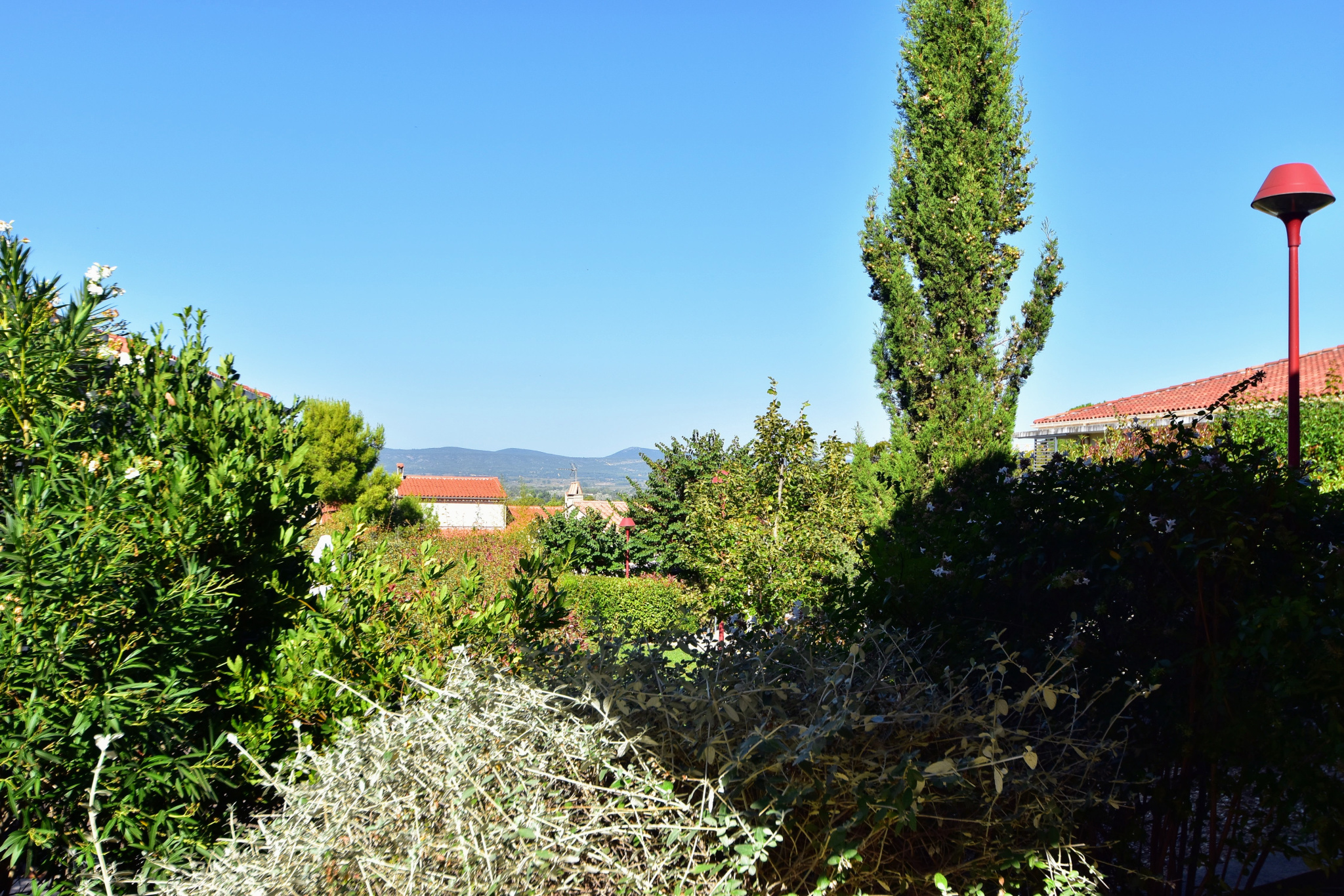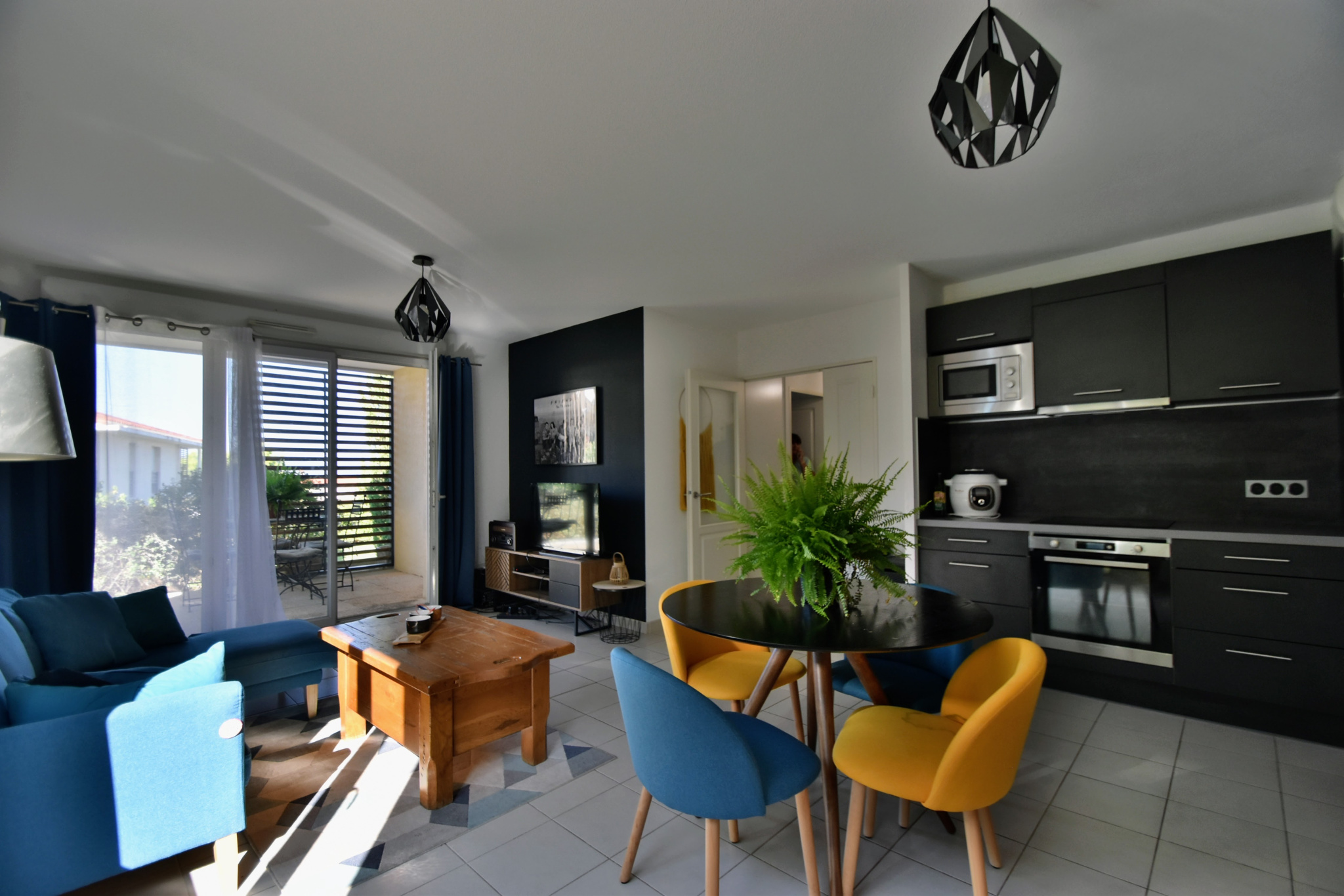 L'appartement est baigné de lumière grâce à une grande baie vitrée qui s'ouvre sur la terrasse, vous offrant une vue imprenable sur le jardin de la copropriété et les montagnes environnantes, créant ainsi un cadre apaisant et agréable.